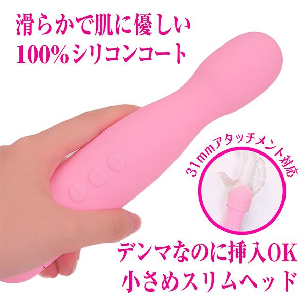 当てても入れてもOKなシリコン製の完全防水式デンマ(電池式)。ヘッド幅3.4cmと細く挿入が可能で、IPX8等級仕様なので入浴しながら使いたい方にうってつけ!強弱は12段階、リズム振動は10パターン搭載♪多彩なアクションながらも3つのボタンで簡単操作!31mmアタッチメントに対応した中イキ派&外イキ派も満足できる逸品。単4電池を4本使用、ピンク