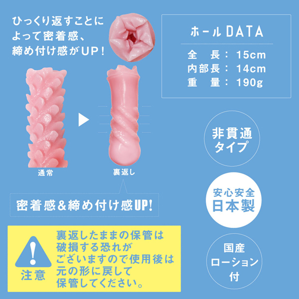 新たなヒダの重なりが未体験の世界へ誘う非貫通オナホ。裏と表で違った刺激が味わえるリバースタイプ!ひっくり返すことで密着感&締め付け感がUPする♪素材はモチモチねっとり絡みつく元祖おなぺっと仕様。洗い流しやすく清潔に保ちやすい新感覚の日本製オナホ。国産ローション付属