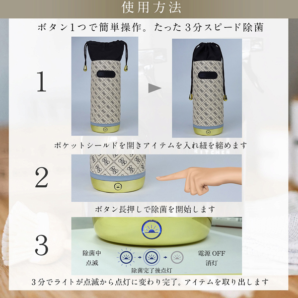 洗いにくいマスクやグッズのウイルス対策に!ボタンをワンプッシュして3分待つだけ、手軽に簡単スグ除菌♪UVC LEDを使ったUSB充電式の持ち運べるUVクリーナー。水銀不使用、アルコールや薬剤が利きにくい菌にも使用できて操作や片付けもスムーズ♪放射線を発しないので密閉環境でもOK!約2時間充電※本品は防水ではありません※UV光を直接見ないようにご注意ください