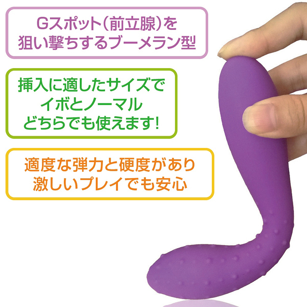 刺激的なイボ突起と滑らかな挿入感のノーマル、2種類が楽しめる双頭ディルド。全長19.5cm、最大幅は3.5cmと適度なサイズ感で、素材は温かみがあり柔らかい高品質なシリコン仕様で肌に優しい設計!Gスポ&前立腺を狙い撃つブーメラン型。水洗いできるので衛生的です♪