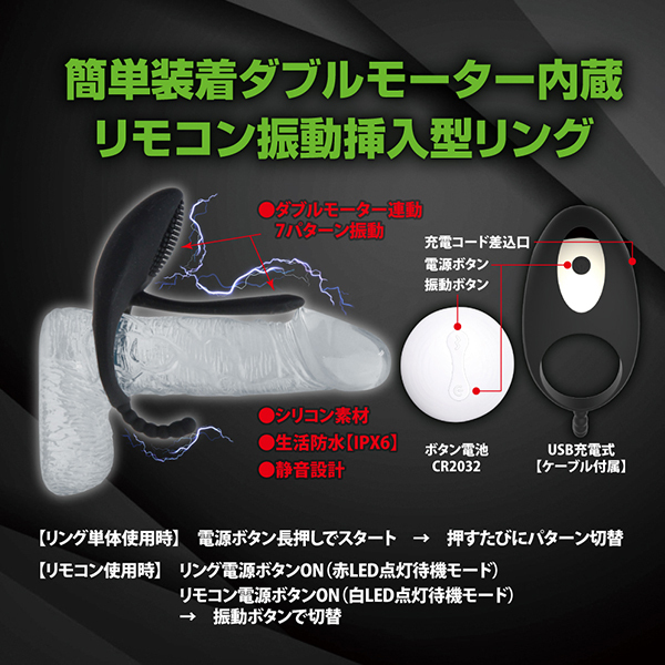 女性を喜ばせるコックリングが超絶進化した!クリへの振動も楽しめる電動コックリング「カム・トゥゲザー」。電源はUSB充電式でリモコン操作が可能♪簡単に装着できてクリへの振動はもちろん、ペニスと共に挿入するサブシャフトも振動するのでアナルへもアプローチできるというトリプルギミックを搭載!中も外も男性自身も振動を味わいながらプレーが楽しめて、男性自身を締め付けながら増強を促す効果も♪各種バイブレーションがリモコン操作できるので振動変化もお楽しみいただけます!7パターンの振動機能にUSB充電式でケーブル付属。シリコン素材でIPX6防水仕様と心強いスペックとなっております♪底部のフックしたアナルビーズのような短いシャフトはアナルに挿入することも可能です。