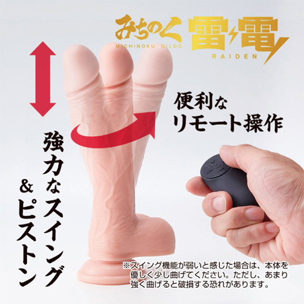 「みちのくディルド雷電」は、リアルで生感たっぷりなディルドバイブです。スイングとピストン機能を備え、さらに遠隔操作が可能なリモコンも付属♪USB充電式で電池切れの心配もありません。最大径は約4cmで太めで吸盤で固定することもできます!柔らかなシリコン素材が心地よい質感と滑らかさを提供します。7パターンのヘッドバイブと5パターンのスイング・ピストン機能が搭載されており、多彩な快感を楽しめます。完全防水仕様なので丸洗いも可能♪電動の「巨根」ディルドとして、驚くほどのパワーと快感を体験できます。