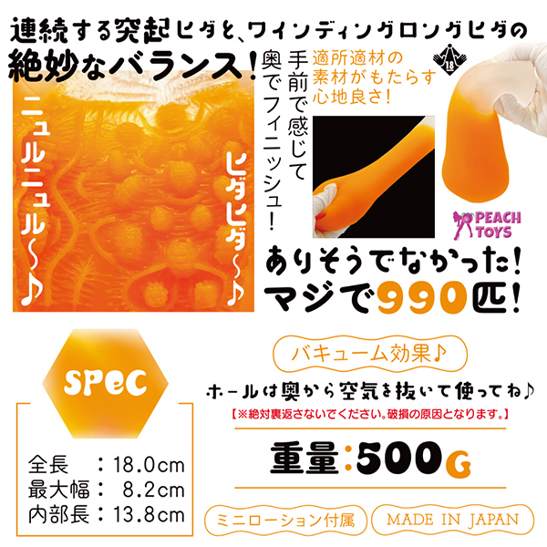 名器に革命!総数990本もの多彩なヒダをぜいたくに配置した非貫通オナホ「KAKU−MEIKI MIMIZU990(カクメイキ ミミズキュウヒャクキュジュウ)」の登場です。ミミズ千匹とは「ヒダが多く存在している名器の例え」ですが、実際に多くのヒダヒダを配置したらどんな感触なのか?ということをコンセプトに真面目に「ミミズ990匹」で作り上げました!フォルムはシンプルな筒型で、挿入口もいたってシンプル。ですが内部構造は只者ではなく、連続する突起ヒダにワインディングロングヒダが迫力満点に襲いかかり、際どい刺激と程よいゾリ感をもたらしながら搾精力を高めてくれます!バランスと長さが異なる990のヒダの数々。持ち手を変えたり、挿入位置やストロークの変化で究極のヒダ刺激を存分にお楽しみください♪