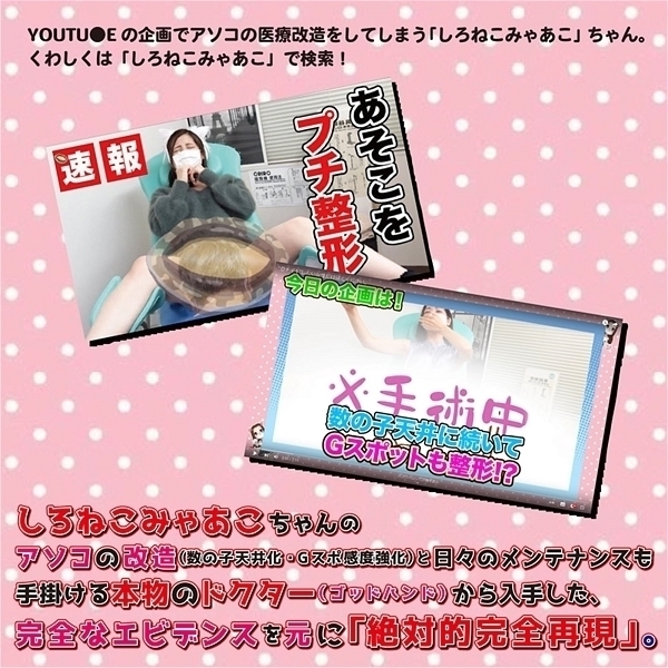 YouT〇be「しろねこみゃあこチャンネル」登録者数『50万人』突破!日本で1番有名なエッチな素人娘『しろねこみゃあこ』ちゃんのオナホールが、キタ――(゜∀゜)――!みゃあこちゃんのアソコの改造(数の子天井化)とメンテンナンスを担当する医師の先生からいただいたエビデンスを元に、内部の感触を完全再現。