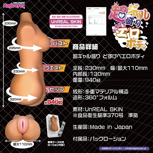 ボリュームあるボディに迫力のあるおっぱい!男の夢を詰め込んだ黒ギャルのカラダ。大きく深いタテひだが単調にならない様に不規則に配置された上にスパイラルすることで、吸い込まれる様な感覚を得られます。ボディ型ならではの様々な体位でも楽しめ、素材には厚生労働省:食品衛生法第370号基準に準拠した「UnREAL SKIN」を採用している贅沢なつくりとなっています。ローション付属