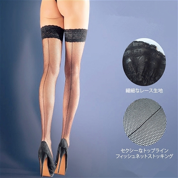 網タイプのニーハイストッキングにレースをあしらった、セクシーさ高まるストッキング。透ける素肌が色っぽさを引き立てます。普段遣いはもちろん、どんなコスチュームにもピッタリ合う定番アイテムです。