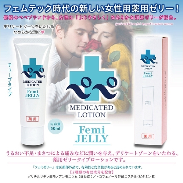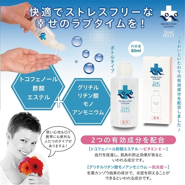 潤い不足・摩擦による痛みなどに潤いを与え、デリケートゾーンをいたわわる、薬用ゼリータイプローションです。「フェミゼリー」は医薬部外品で、有効性と安全性があると認められています。2種類の有効成分を配合、グリチルリン酸モノアンモニウム(抗炎症)/トコフェノール酢酸エステル(ビタミンE)●50ml