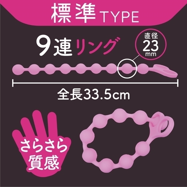 直径23mmの9個のシリコンビーズが連続に襲ってくる中級者向け。まずはここからメス化TRY!取っ手部のサイズは55mm全長335mmと全てシリコン素材の為、柔らかく丸洗いも出来て清潔に保っていただけます。