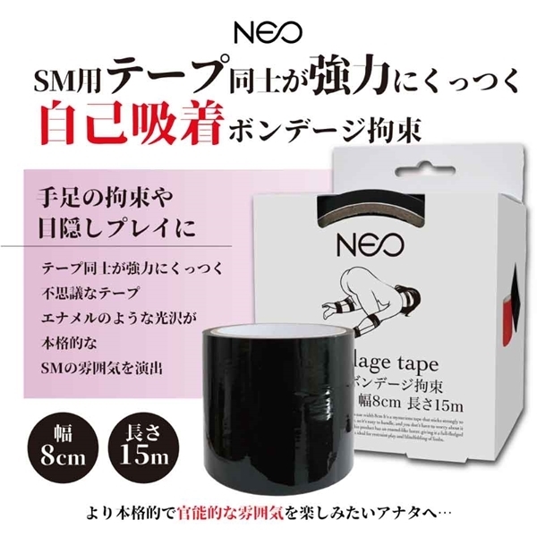 糊がないのにテープ同士が強力にくっつく不思議なテープです。非粘着なので扱いやすく目隠しの際に髪に引っ付く心配もありません。本製品はエナメルみたいな光沢があるため本格的なSMの雰囲気になります。幅が8cmもあるので手足の拘束プレイや目隠しに最適です。●カラー:黒