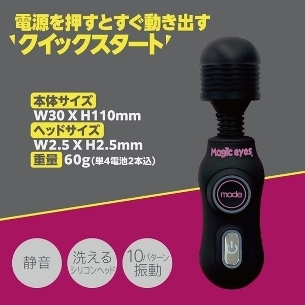 1秒間で250回転の強振動モーターを搭載した小型デンマ。電源の長押しが必要ないクイックスタートタイプ。洗えるシリコンヘッドと10パターン振動、静音設計とカワイイ見た目に似合わない高性能。単四電池が2本付属していますので購入してすぐにご使用いただけます。●カラー:ピンク