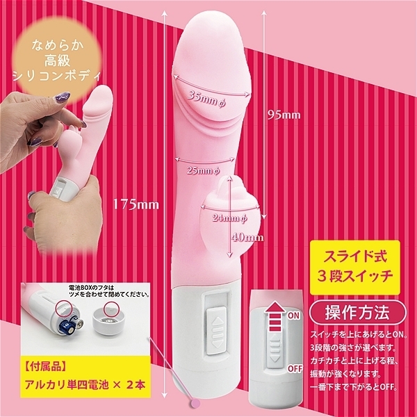 パッケージ:19.5×5.5×3.5cm 本体:17.5×2.5cm・挿入部:9.5×3.5cm・小バイブ4.0×2.4cm 電池:単四電池×2本使用
