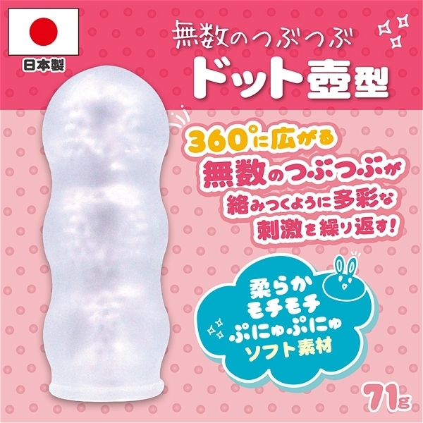 360度に広がる無数のつぶつぶが絡みつくように敏感な部分を刺激する。窄まる3つのエリアで搾り取る。どんな人にでもぴったりフィットする伸縮性抜群の日本製エラストマーを使用。ローション付属。イラストレーター:むらさき