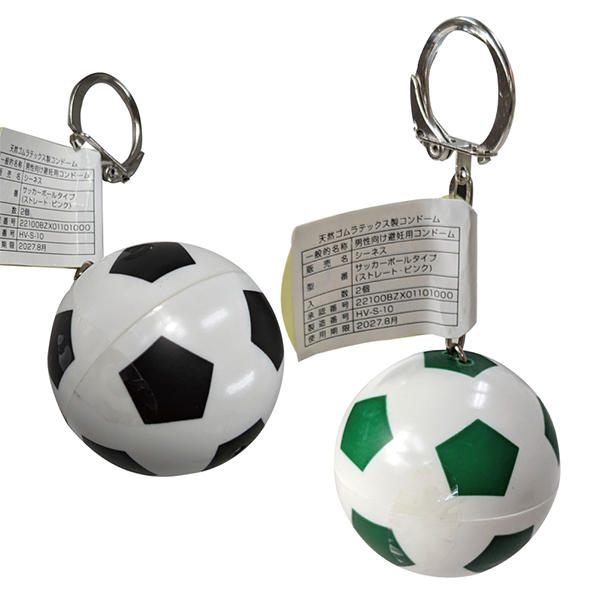 サッカーボール型のキーホルダーを開けると香り付コンドームが入っています♪カバンにつけても馴染む、キーホルダー収納タイプ!
