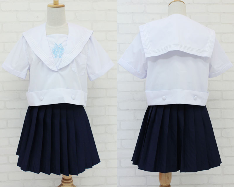 胸元にある水色の刺繍が涼やかな、白セーラー&濃紺スカートの制服コスプレセット。清涼感いっぱいの白い半袖セーラーブラウスは、サイドファスナー仕様。裾は前後に2個ずつボタンを使用した幅広なベルト風になっており、後姿も可愛く仕上げました。濃紺プリーツスカートのウエストはアジャスターで調節可能。白&濃紺のコントラストは、まさに鉄板!憧れのお嬢様になれちゃうセーラー服コスチュームです!※水洗い不可、塩素系漂白剤による漂白不可、アイロンは中温で当て布使用、ドライクリーニング可、色落ちの可能性があります。※こちらの商品は在庫の状況によりお届けまでに4日〜7日程度かかる場合がございます。