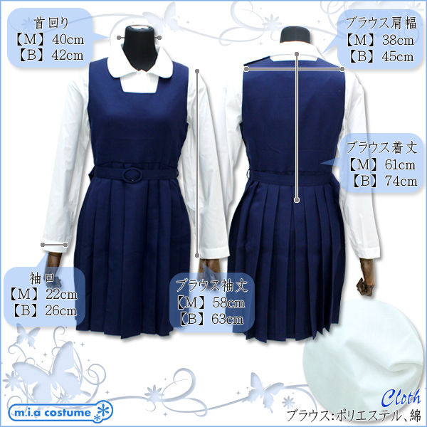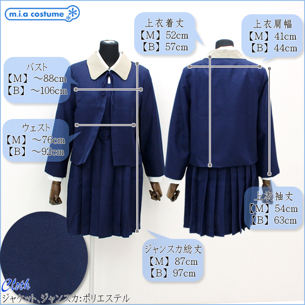 Mサイズ:B〜88cm・W〜76cm ブラウス(着丈61cm・肩幅38cm・袖丈58cm・袖口22cm・首回り40cm) ジャケット(着丈52cm・肩幅41cm・袖丈54cm) ジャンパースカート(総丈87cm) セット内容:ジャケット、丸襟ブラウス、ジャンパースカート、ベルト