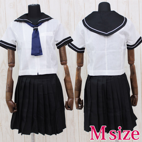 後ろが四角じゃない?!変形セーラー襟が超可愛い制服コスチューム。●フロントファスナーで着用が簡単な黒×白の半袖セーラートップス●先端をカットしたボウタイ風の青いスカーフ●膝丈のプリーツスカート●袖口・襟・スカーフ留めに細い白ラインを1本入れて全体をキリッと引き締めました。元気のある子にも、おしとやかな子にもお似合い!着るだけで学生気分に浸れます。※水洗い不可、塩素系漂白剤による漂白不可、アイロンは中温で当て布使用、ドライクリーニング可、色落ちの可能性があります、ご注意ください。※こちらの商品は在庫の状況によりお届けまでに4日〜7日程度かかる場合がございます。