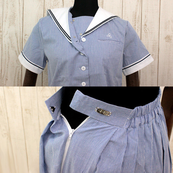 Mサイズ:B〜95cm・W〜72cm 上衣:着丈50cm・袖丈20cm・肩幅39cm・首周り42cm(胸当て外して52cm) スカート:丈45cm セット内容:セーラー上衣(胸当てスナップボタン2点有、前開きボタン留め、胸ポケット有)、スカート(サイドファスナー、3段ホック留め、サイズ調整:ウェスト背部に一部ゴム入り) 素材:ポリエステル100%