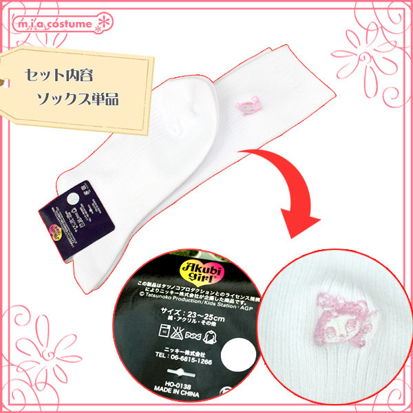 【在庫限り!大特価】嬉しいプチプラ価格♪大人気「アクビちゃん」のワンポイント刺繍入りソックス。●すっきりシンプルなホワイトカラー●アクビちゃんのワンポイント刺繍入り●約25cmのスリークォーター(4分の3)丈。ピンク色のアクビちゃん刺繍が可愛いショート丈ソックス。優しい履き心地でスクール用の靴下にも最適です。※塩素系漂白剤による漂白不可。