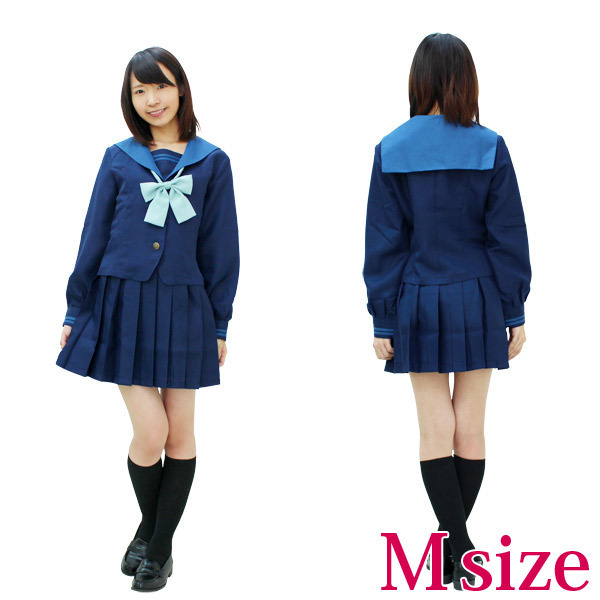 学生らしいさわやかなブルー系♪襟の色が特徴的な人気の旧冬服セーラー服(Mサイズ)。紺無地のセーラーブラウスとプリーツスカートに、ブルーグリーンのリボンがポイントの制服コスプレ。胸当てとリボンはスナップボタンで着脱可能です。※水洗い不可、塩素系漂白剤による漂白不可、アイロンは中温で当て布使用、ドライクリーニング可、色落ちの可能性があります。