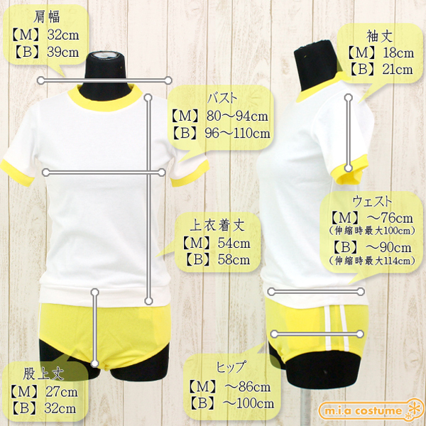 Mサイズ B80〜94cm・W〜76cm(伸縮時最大100cm)・H〜86cm 上衣:着丈54cm・肩幅32cm・袖丈18cm ブルマ:股上丈27cm セット内容:上衣、ブルマ 素材:ポリエステル65%、コットン35%