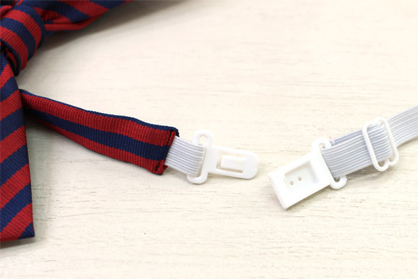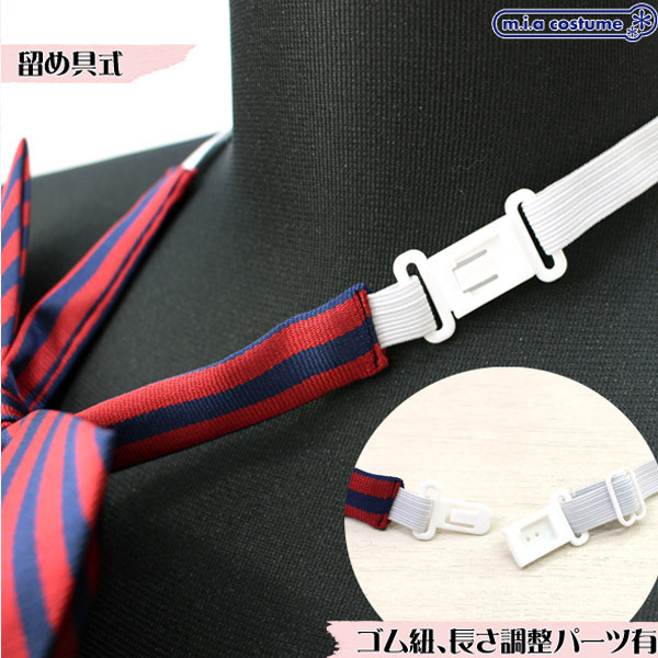 紺とエンジを組み合わせた大きめのストライプ柄のスクールリボン。留め具で身に着けるだけで装着簡単!ゴム紐は長さを調節出来るため、好みに合わせたサイズに変更していただけます。制服衣装のコスプレアイテムとしてはもちろん現役学生さんの制服小物にも最適!可愛らしさがアピールできるように、形にもしっかりこだわったスクールリボンです。※水洗い不可、塩素系漂白剤による漂白不可、アイロンは中温で当て布使用、ドライクリーニング可、色落ちの可能性があります。※こちらの商品は在庫の状況によりお届けまでに4日〜7日程度かかる場合がございます。