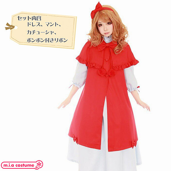 ハロウィン仮装や文化祭用の衣装にも最適♪名作童話の主人公になりきれる!ロングドレスでクラシカルにまとめたロリータ風赤ずきんコスプレ。フリルやリボンをあしらった真っ赤なマントに、ハイネックの白ロングワンピを合わせることで上品かつ可愛くデザイン!袖口に小さなリボンを飾っているところにも、こだわりを感じる一着です。カチューシャ付※塩素系漂白剤による漂白不可、洗濯の際はリボンなどの付属品を外し個々単独での手洗いをお願いします、色落ちの可能性があります。※こちらの商品は在庫の状況によりお届けまでに4日〜7日程度かかる場合がございます。