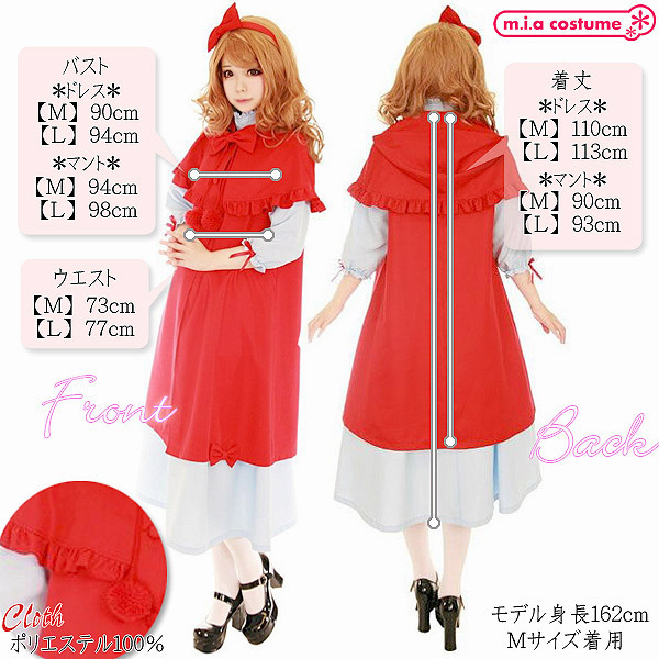 Mサイズ:ドレス(B94cm・W77cm・着丈113cm)・マント(B98cm・着丈93cm) セット内容:ドレス(後ろファスナー)、マント(前ボタン)、カチューシャ(ブローチピン付き)、ボンボン付きリボン 素材:ポリエステル100%