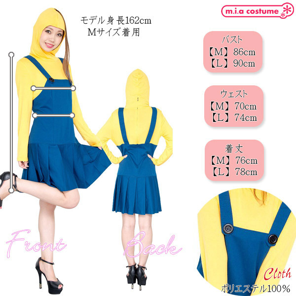 黄色と青のカラーリングが特徴的!某人気キャラをイメージした長袖仕様の可愛いデニム風一体型ワンピース(背面ファスナー式)。スカートは立体感のあるプリーツタイプ♪テーマパークやハロウィンで、お友達とお揃いで着れば楽しさ倍増!露出控えめのハロウィン仮装をお求めの方にも◎色落ちの可能性があるため、商品単体を手洗いするようお願いいたします。塩素系漂白剤での漂白不可※塩素系漂白剤による漂白不可、洗濯の際はリボンなどの付属品を外し個々単独での手洗いをお願いします、色落ちの可能性があります。※こちらの商品は在庫の状況によりお届けまでに4日〜7日程度かかる場合がございます。