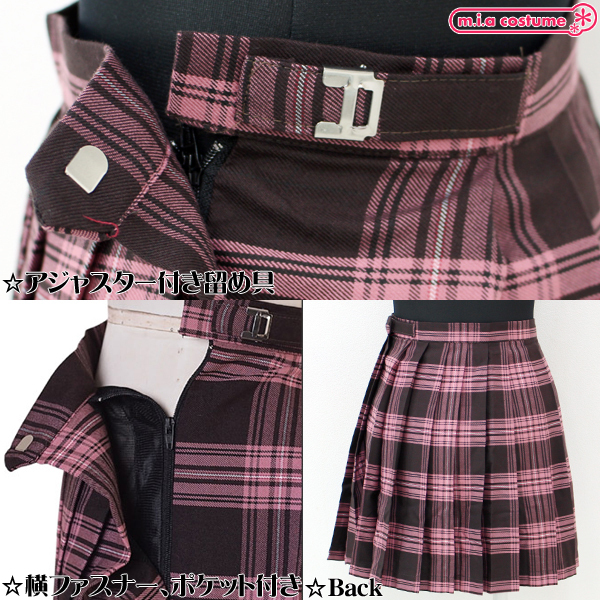 ピンク×ブラウンのカラーリングが可愛いチェック柄のプリーツスカート単品。横ファスナーを上げてアジャスター付きの留め具で引っ掛けるだけで手軽に着られる♪オリジナルの制服コスプレを楽しみたい時に◎小物が入れられるポケット付き。※水洗い不可、塩素系漂白剤による漂白不可、色落ちの可能性があります。※こちらの商品は在庫の状況によりお届けまでに4日〜7日程度かかる場合がございます。