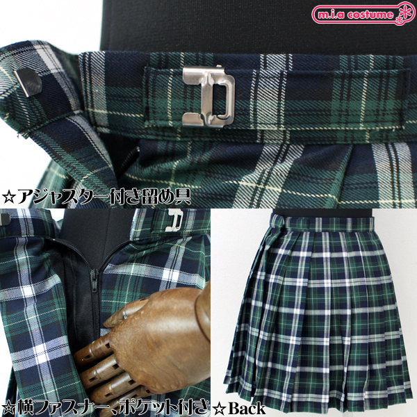 ウエスト調節可能なアジャスター付き留め具が付いた本格派のチェック柄プリーツスカート単品。いつもの制服を自分好みにアレンジしよう♪サイドは横ファスナー&小物が入るポケット付き。色んなコーデに合わせやすい緑×白カラー※色落ち防止のため、水洗い&塩素系漂白剤での漂白は不可※水洗い不可、塩素系漂白剤による漂白不可、色落ちの可能性があります。※こちらの商品は在庫の状況によりお届けまでに4日〜7日程度かかる場合がございます。