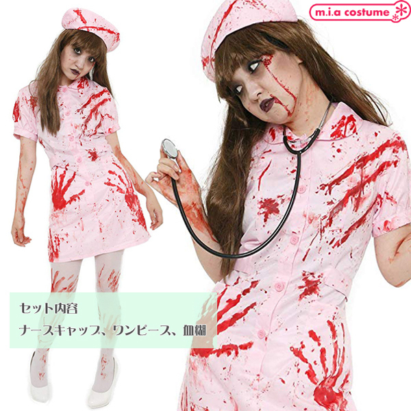 ホラーメイクをすれば雰囲気マシマシ!血糊が付いたピンクカラーのナースコスプレ。ハロウィン大人気のゾンビなナースになりきろう♪ワンピース、ナースキャップ、血糊がセットになった3点セット。友達やパートナーと一緒に仮装してホラーナイトハロウィン!※水洗い不可、塩素系漂白剤による漂白不可、アイロンは中温で当て布使用、石油系ドライクリーニング可、色落ちの可能性があります。※こちらの商品は在庫の状況によりお届けまでに4日〜7日程度かかる場合がございます。