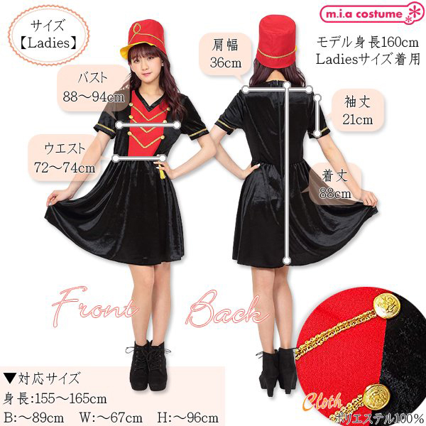 フリーサイズ:B88〜94cm・W72〜74cm・肩幅36cm・袖丈21cm・着丈88cm セット内容:帽子、ワンピース(裏地なし、背面ファスナー) 素材:ポリエステル100% 対応サイズ:身長155〜165cm・B〜89cm・W〜67cm・H〜96cm