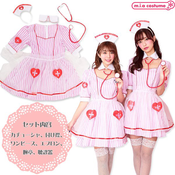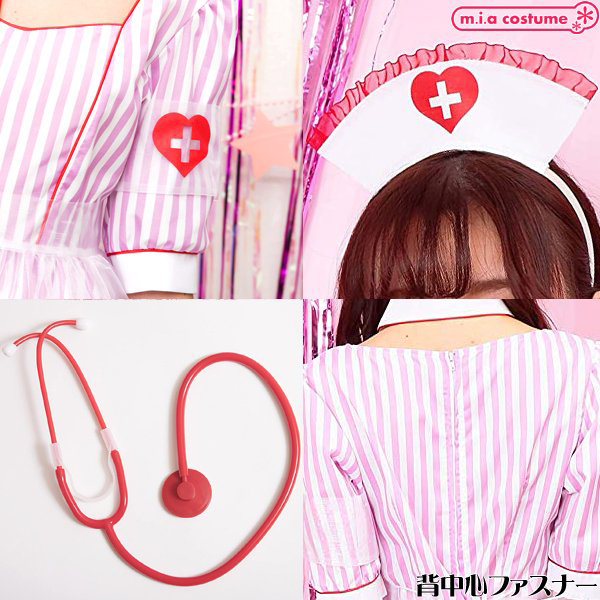 ハロウィン用のコスチュームとしてだけではなく、仮装コスプレとしてもどうぞ♪ストライプ生地に、オーガンジーの透けた紋章とエプロンがかわいいナースコスチュームです。聴診器も付いていて充実の6点セットが嬉しい♪付け襟と開いた胸元が魅力的でポップな配色がフォトジェニックです。カラバリもあるので双子コーデにもおすすめ!変装用としてだけではなく、雰囲気を盛り上げたいときにもどうぞ♪※洗濯不可、塩素系漂白剤による漂白不可、アイロンは中温で当て布使用(プリント部分のアイロンはお避け下さい)、ドライクリーニング不可