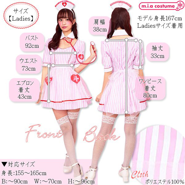 Mサイズ 対応サイズ:身長155〜165cm・B〜90cm・W〜70cm・H〜96cm 実寸:B92cm・W73cm・肩幅38cm・袖丈33cm・着丈80cm、エプロン丈43cm セット内容:カチューシャ、付け襟、ワンピース(背中心ファスナー)、エプロン、腕章、聴診器 素材:ポリエステル100%
