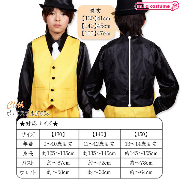 130サイズ 対応サイズ:身長125〜135cm・B〜67cm・W〜58cm 実寸:着丈41cm セット内容:ベスト単品(前ボタン) 素材:ポリエステル100%