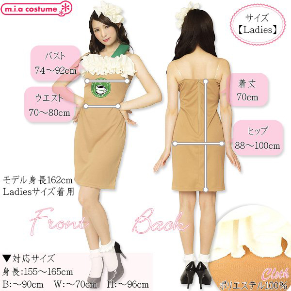 ハロウィン仮装やクリスマスの仮装、変装用のステージ衣装にも!フォームミルクをイメージした胸元のフリルがポイントのワンピースです。ストレッチ素材なので着やすくコーヒーカラーなワンピースが印象的♪付属のシールを胸元に付ければスタイリッシュなカフェスタッフに!舞台衣装としても映えますよ♪※洗濯機不可、塩素系漂白剤による漂白不可、アイロンは中温で当て布使用、ドライクリーニング不可、摩擦や水濡れにより色移りする恐れがあります。