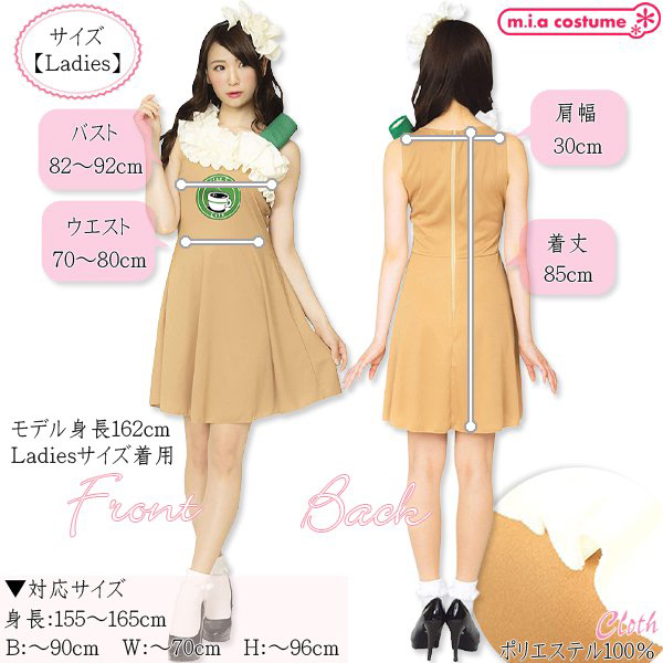 レディライクな着こなしに最適!フォームミルクをイメージした胸元のフリルがポイントのワンピースです。ハロウィンやクリスマス仮装、変装用のステージ衣装や舞台衣装として注目されること間違いなし!コーヒーカラーのワンピースはストレッチ素材で着やすく付属のシールを胸元に付ければキュートなカフェスタッフに!ふわっと裾の広がったスカートで女性らしい印象を出しちゃおう♪※洗濯機不可、塩素系漂白剤による漂白不可、アイロンは中温で当て布使用、ドライクリーニング不可、摩擦や水濡れにより色移りする恐れがあります。