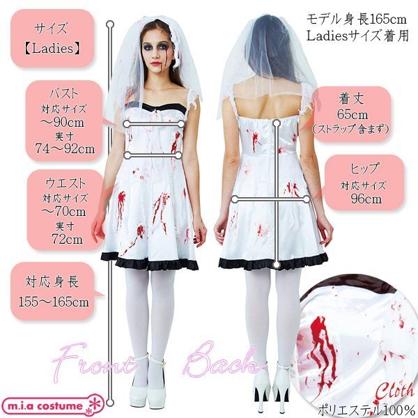 フリーサイズ:身長155〜165cm・B74〜92cm・W72cm・着丈65cm(ストラップ含まず) セット内容:ヴェール付きカチューシャ、ワンピース(裏地無し、背中心ファスナー)、血糊 素材:ポリエステル100%