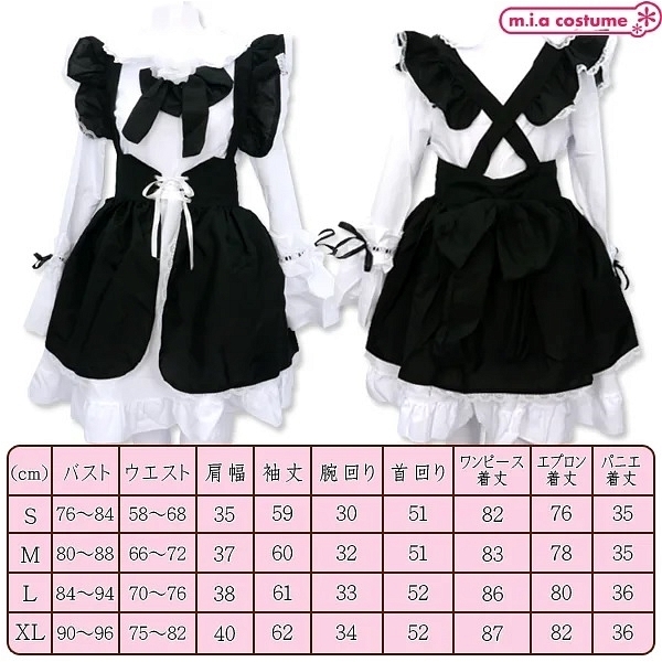 Sサイズ:B76〜84cm・W58〜68cm・肩幅35cm・袖丈59cm・腕周り30cm・首周り51cm・着丈(ワンピース82cm、エプロン76cm、パニエ約35cm)・帽子頭周り55cm セット内容:胸リボン付きワンピース、編み上げリボン付きエプロン、パニエ、コサージュ、カチューシャ、帽子