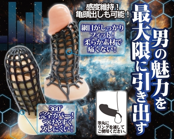 驚異のフィット感!オールカバーにもハーフカバーにもなるメッシュ状のペニスサック。●メッシュ加工のスパイダー●サイズを選ばない伸縮素材●全体を覆う抜群のフィット感●固定できる玉掛けリング付き●先端穴から亀頭出しも可能●装着したまま射精してもOK。蜘蛛の巣で男性力を強化!軽い着け心地でもしっかりフィットするペニスサック。玉掛けリングは安定性を高めるだけでなく、締め付け効果で勃起力もUP!男性の魅力を最大限に引き出してくれます。