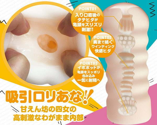 スケベ四姉妹と中出しSEX!甘えん坊四女アオイの高刺激オナホール「おなシスタ04 碧(AOI)」。『おなガール』の血を受け継いだ新シリーズ『おなシスタ』が登場!入り口直後の縦ヒダが亀頭をズリズリ刺激!奥まで続く快感ワインディングヒダを抜けた後は、イボポッドが亀頭をスッポリ包み込んで一気に射精へと誘います。