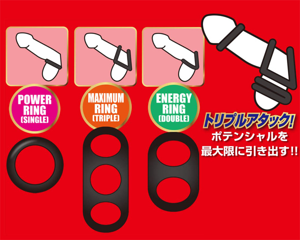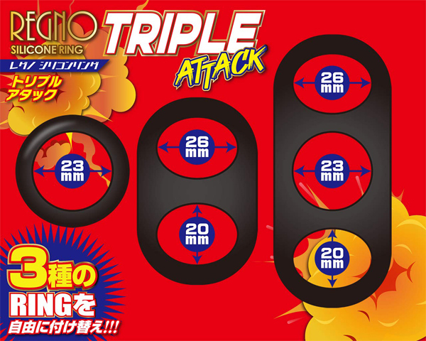持久力×勃起力×射精力UP!3種類のリングを自由に付け替えてSEXや自分磨きに使える「レグノシリコンリング」(トリプルアタック)。商品内容はドーナツ型のシングルタイプと2点締めのダブルタイプ、そして3点締めのトリプルタイムと3種類のリングがセット!適度な柔軟性と締め付けが期待できる素材はピュアシリコン製。フィット感が強くしっかりした締め付けができるのが特徴!SEXや自分磨き、付け方次第で攻守ともにシーンを選ばず力を発揮♪その日の気分や体調によって付け替えたりと、使い勝手は抜群です。