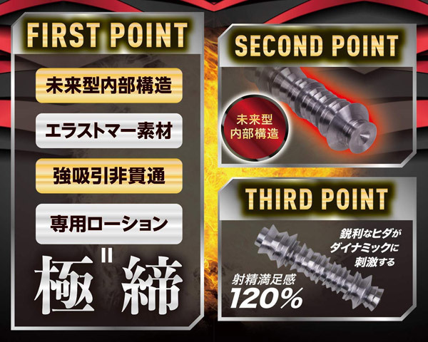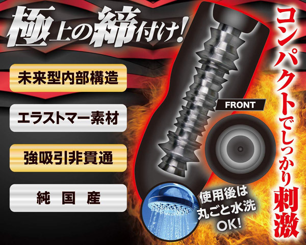 射精満足感120%!!小型ホールのポテンシャルを超越した未来型内部構造を搭載。強吸引の刺激がマッハで射精を促す!鋭利なヒダの凸凹が生み出すダイナミックな刺激と極上の締め付けで亀頭に喰らい付き搾り取る。●専用ローション付き●使用後は丸ごと水洗いOK!