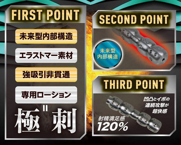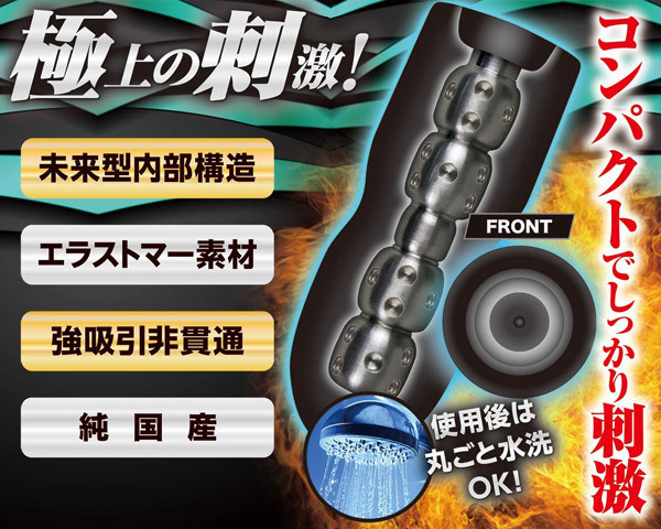 射精満足感120%!!小型ホールのポテンシャルを超越した未来型内部構造を搭載。強吸引の刺激がマッハで射精を促す!凸凹構造+無数のイボによる亀頭への連続攻撃が極上の刺激と超快感を生み出す。●専用ローション付き●使用後は丸ごと水洗いOK!