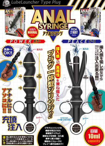 お尻へ挿入しながら中に液体を注入できる2股形状のプラグ一体型シリンジ。注入口をローションや洗浄液などの液体につけてレバーを引くだけで充填完了!挿入感を楽しみながら中へサッと注入できる、効率と手軽さを両立させた新感覚アイテムです。弾力素材エラストマーを使用で肌触り滑らか♪容量10ml