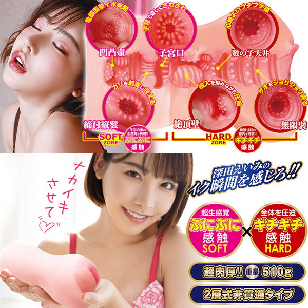 ボリューミーなFカップ爆乳&小悪魔な顔立ちで世の男性を魅了する元アイドルAV女優「深田えいみ」さん監修!イク手前のギュッと締まる膣内を忠実再現した非貫通オナホ。リアルな生感覚の柔らか素材と圧迫刺激する硬質素材の2層で仕立てた510gの超肉厚ボディ♪プチプチ感が心地良い数の子天井やカリを咥え込む縦ヒダその他複数のギミックを設置。オリジナルボトルローション付