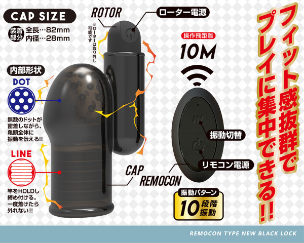 爆発的人気の亀頭責めローター「ブラックロック」シリーズ最新作!小型リモコンによる遠隔操作でハンズフリーで楽しめるUSB充電式ローター。フィット感抜群のキャップ内には密着感を高めるドットと横溝を配置!サオをギュッと締め付けながら亀頭を細かに刺激する!振動は10段階搭載、操作飛距離は10mまで対応。防水式でお手入れ簡単。