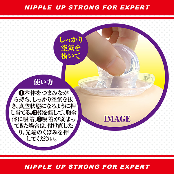 乳首を肥大化させたり開発したい方へ!チクビにギュン♪誰でも簡単に開発できる乳首グッズ「ニップルアップ!」シリーズから「ストロングforエキスパート」が新登場♪吸着面積はシリーズ最大サイズで抜群の吸着力が自慢。これを使えば感じるチクビへ大変身!乳首&おっぱい全体に装着して強力吸引を楽しむニップルパッドは陥没乳首の矯正にも使用OK。【使い方】@本体をつまみながら持ち、しっかり空気を抜き、真空状態になるように押し当てます。A指を離して胸全体に吸着。B吸着が弱まってきた場合は、付け直したり、先端のくぼみを押してください。男女兼用で2個セット、ケース入りです♪いつものプレイに導入したり、乳首の感度開発、陥没乳首の矯正なんかにも使えそうなニップルアイテムとなっています。