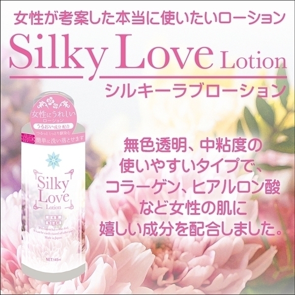 「肌になじみやすい」「潤い・保湿が欲しい」「コスパ高がいい」etc.そんなユーザーの想いを実現するために女性が考案したのがシルキーラブローション。コラーゲンやヒアルロン酸など肌に嬉しいうるおい成分に加えホホバ油を配合することでお肌へすっとなじむ仕上がりに。カキタンニンによる消臭効果も期待でき、さらに使用後は簡単に洗い落とすことができます。本当に必要な成分・性能を厳選した無色透明の中粘度ローションです。<成分>精製水、グリセリン、PG、カルボマー、EDTA-2Na、フェノキシエタノール、カキタンニン、アルギニン、キサンタンガム、ホホバ油、ヒアルロン酸Na、水銀化コラーゲン、ザクロエキス、ローズウォーター、水銀化Na