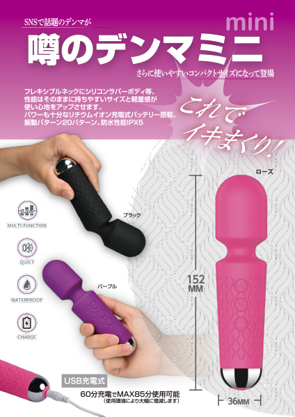 小型ながらもしっかりとイカせてくれる「噂のデンマミニ(MINITOY)」です♪ネットで話題のデンマがさらに使いやすいコンパクトサイズになって新登場!お手頃な価格設定で汎用性が高く、フレキシブルネックにシリコンラバーボディ等、性能はそのままに持ちやすいサイズと軽量感が使い心地をさらにアップさせました♪パワーも十分なリチウムイオン充電式バッテリーで電源はUSB充電式!60分の充電で最大85分使用可能(使用環境により大幅に増減します)。防水性能IPX5で振動パターンは20パターンを搭載!3種類のカラーバリエーション展開でこちらはローズとなっています。